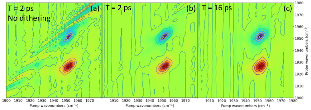 Le graphique ci-dessous présente les spectres 2DIR obtenus dans la carboxyhémoglobine après une transformée de Fourier par rapport au délai temporel entre les deux impulsions de pompe. Les données brutes (a) montrent des oscillations indésirables dues à la diffusion cohérente des impulsions de pompe. Cependant, cet effet peut être atténué en modulant le délai pompe-sonde à l'aide de la cale piézoélectrique (pzt) comme illustré dans la figure précédente.