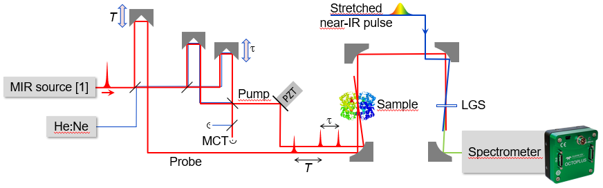 Un atout majeur du projet MIRThyX réside dans une avancée récente, publiée au début de l'année 2019 par deux des partenaires (LCF et AS), qui consiste en la compression temporelle efficace à 7 fs d’impulsions de 300 fs délivrées par un amplificateur à fibre dopée à l’ytterbium. La largeur spectrale des impulsions à haute énergie ainsi obtenues est suffisamment large pour générer directement des impulsions dans l’infrarouge moyen (MIR) par différence de fréquences intrapulse. Cette approche permettra de produire des impulsions MIR dans une configuration simple et monofaisceau à un taux de répétition de 125 kHz, idéal pour la spectroscopie 2DIR à l’équilibre.