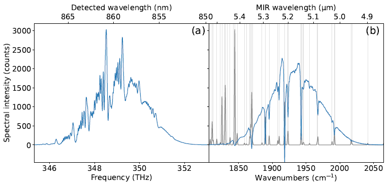 La figure ci-dessous montre le spectre correspondant à une impulsion unique (a). Après un traitement approprié par transformée de Fourier, les effets de modulation de phase croisée peuvent être supprimés, produisant un spectre corrigé (b) avec une résolution spectrale de 1 cm⁻¹, comme en témoignent les lignes d'absorption étroites résultant de l'absorption de la vapeur d'eau.