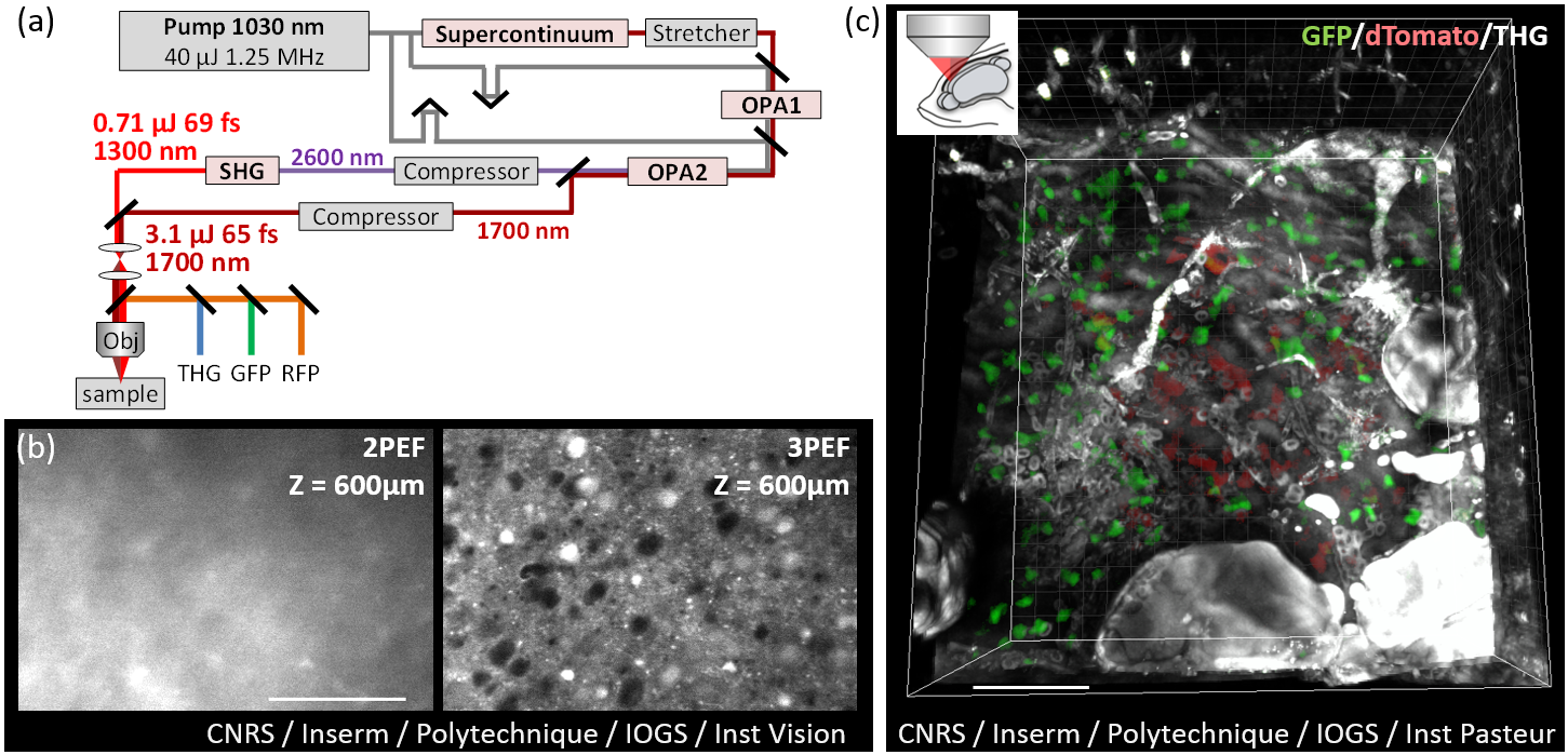 (a) Dual-color laser source optimized for 3P microscopy. (b) Comparison of 2P and 3P in-depth imaging of ex vivo mouse brain tissue. (c) in vivo through-skull 3P/THG imaging of two neural cell populations in an adult zebrafish brain. © CNRS, Inserm, Polytechnique, IOGS, Inst Vision, Inst Pasteur / Springer-Nature. Adapted from Guesmi, Abdeladim et al, Light Sci App 2018.