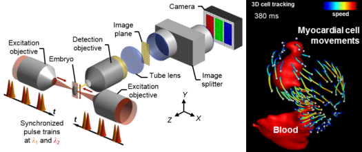 Left: setup for multicolor two-photon light sheet microscopy using wavelength mixing. Right: 3D reconstruction of cell movements in the beating heart of a zebrafish larva. Image size is 210 * 230 * 300 µm3. Speed scale ranges from 0 to 620 µm/second. Adapted from Mahou et al, 2014.