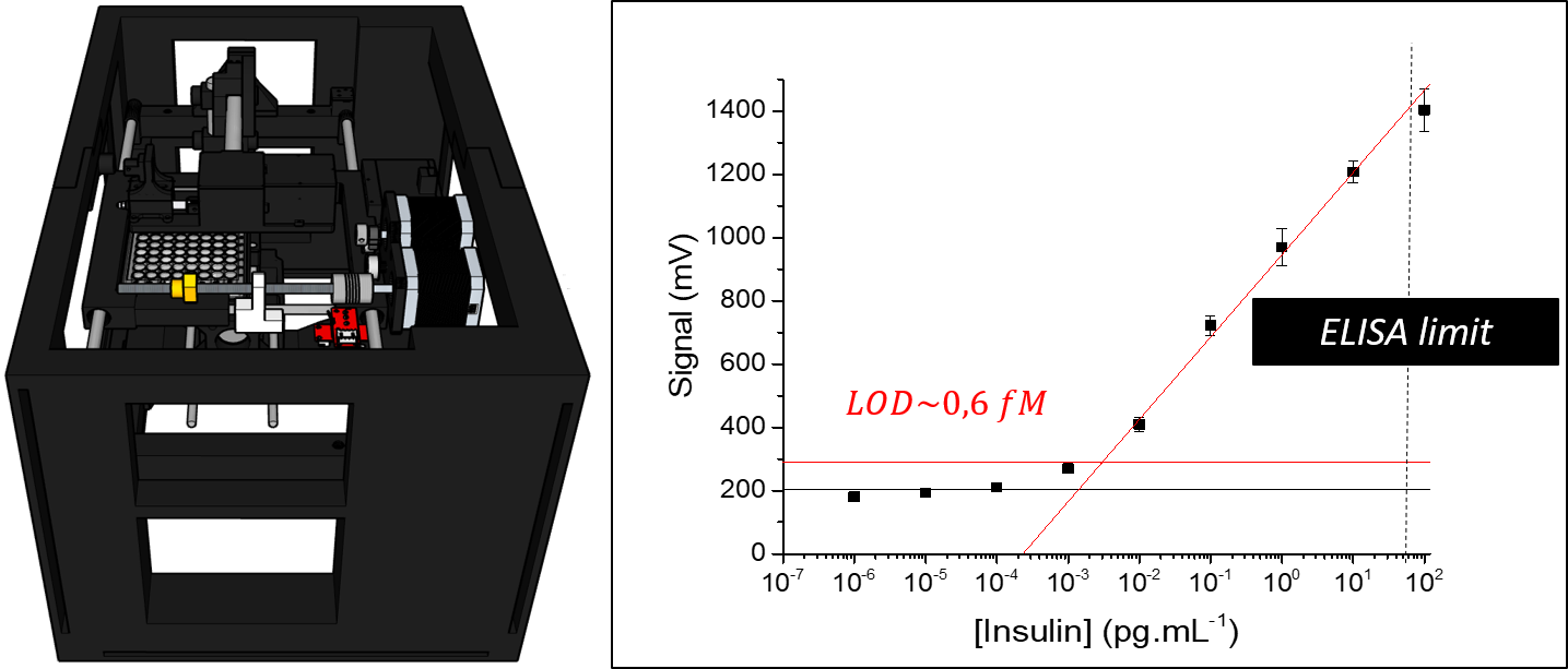 Droite: Plan du système de détection ultra-sensible, basés sur l'excitation UV et la collection résolue en temps. Gauche: Détection de l'insuline dans du tampon aqeux et comparaison au test ELISA de référence.