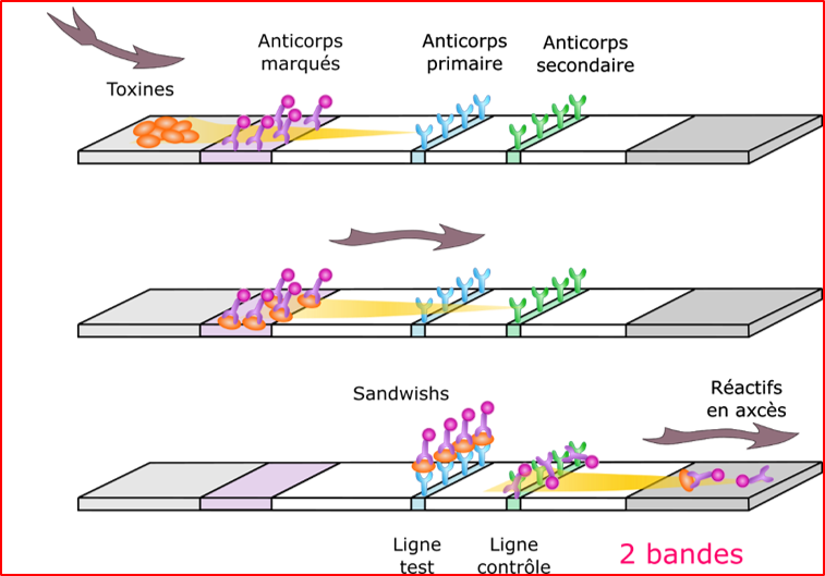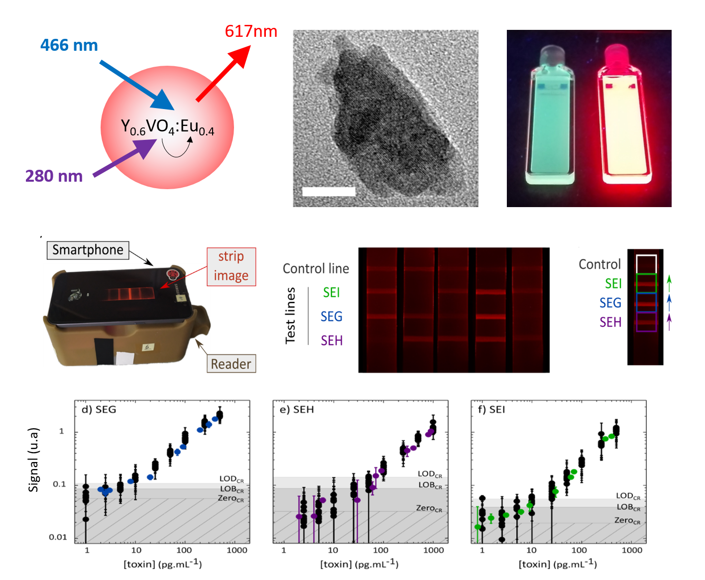 La détection sensible in vitro de biomolécules est essentielle dans de nombreux contextes, notamment pour les applications médicales, que ce soit pour l'identification efficace de pathogènes ou la surveillance de biomarqueurs. La possibilité d'atteindre une sensibilité élevée avec des dispositifs simples est donc un objectif important pour améliorer la caractérisation des échantillons environnementaux ou l'efficacité du diagnostic et, par conséquent, la prophylaxie ou les soins aux patients. À cette fin, nous développons l'utilisation de nanoparticules photoluminescentes à base de lanthanide en tant que rapporteurs biologiques in vitro ultrasensibles. Ces nano-objects, synthetisés au Laboratoire de Physique de la Matière Condensée (Ecole Polytechnique) ont des propriétés optiques reamarquables, avec notamment une brillance et une photstabilité exceptionnelles. Nous mettons notamment au point des protocoles et l'instrumentation pour la détection multiplexée rapide à l'aide de tests chromatographiques à based de membranes de nitrocellulose (or Lateral Flow Assays ). A l'aide de ces développpements technologiques, nous réalisons la détection quantiatative de multiple pathogènes à très haute sensibilité (picomolaire) pour des test rapides (Figure).