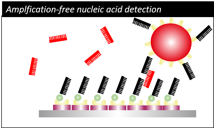 Nous développons des technologies pour la détection ultra-sensible - à des concentrations femto- ou attomolar range) de protéines et d'acides nucléiques (ADN et ARN) dans des échantillons biologiques, comme alternatives aux méthodes usuelles et aux plus sensibles récemment développées (ELISA, ECLIA, Simoa, (q)PCR ,...), en utilisant respectivement des méthodes d'immunomarqage et d'hybridization . Avec le développement d'instrumentation ad hoc, nous réalisons la détection de cibles multiples dans des environnements variés (tampons acqueux, plasma, sérum, culture cellulaire), qui consistuerons la base de futurs tests de diagnostic in vitro.