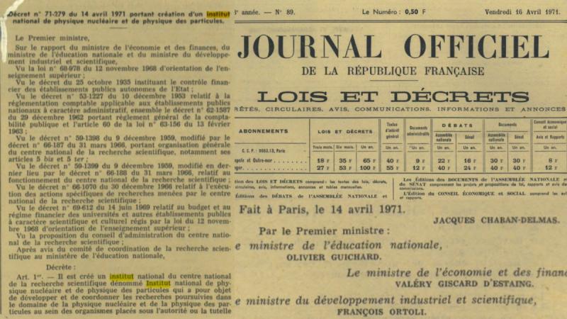 Il y a 50 ans, le 1er ministre Jacques Chaban-Delmas signait un décret « portant création d’un Institut national de physique nucléaire et de physique des particules.